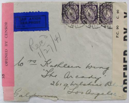 Carta dirigida a Los Ángeles (USA) con varias fajas de censura.