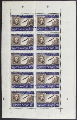 Raro en hoja de diez, ligero corte y varios pliegues que no afectan a los sellos. Catálogo Sassone 3.750.000 liras.