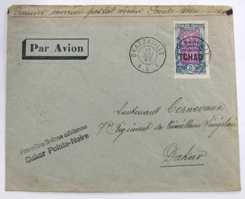 1937. Precioso sobre por avión de Brazzaville a Dakar con marca de Primer Vuelo Dakar Pointe-Noire.