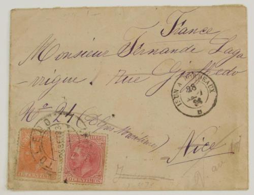 28/sep/1883, muy bonit0 ( franqueo de 2 emisiones) de Toledo a Niza y reexpedida a Vardos ( Francia )