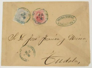 1879, sobre con doble porte (10c+25c) con  fechador azul de Calahorra ( Logroño ) a Tudela