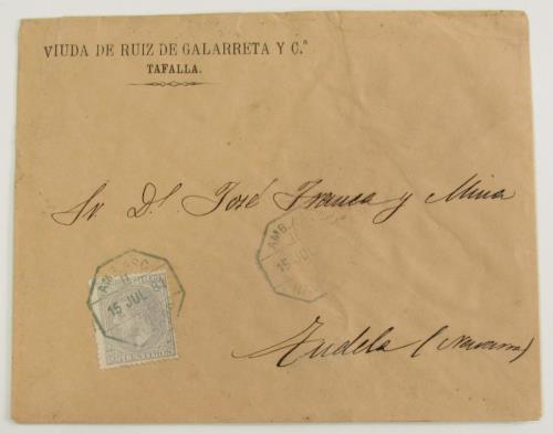 Sobre con matasellos azul de Tafalla a Tudela (conservación regular)