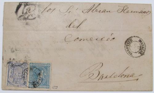 18/10/1875. Preciosa carta de Capdepera a Barcelona, franqueada con sello de 10c y 5c Impuesto de Ventas en lugar de Impuesto e Guerra (muy raro uso postal), con fechador de Manacor (Mallorca).