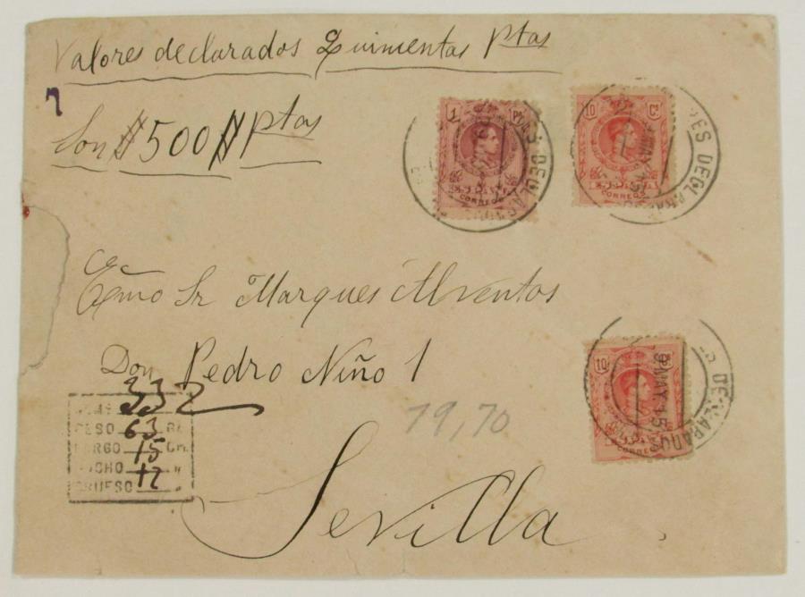 9/Mayo/1915, muy bonito sobre ( pese rotura producida por la apertura) de valores declarados de 500 pts de Madrid a Sevilla