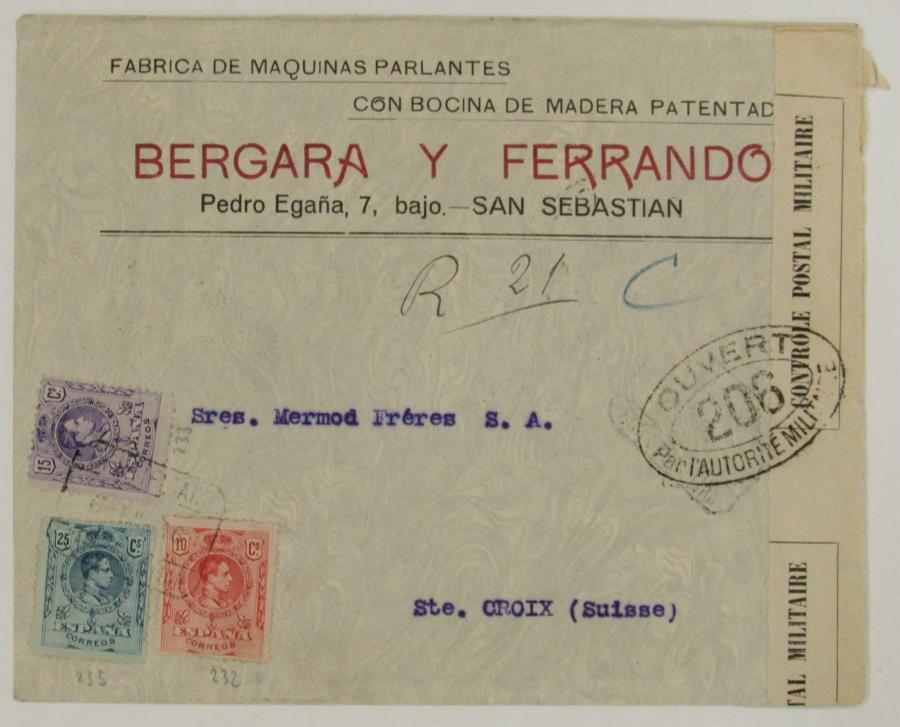 8/1/1916, muy bonito sobre certficado de San Sebastian a S.Croix – Suiza