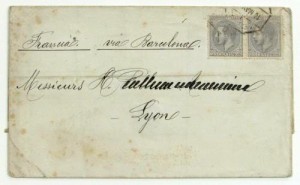 Pareja en carta a Lijon (Francia) con matasello ambulante vía Barcelona.
