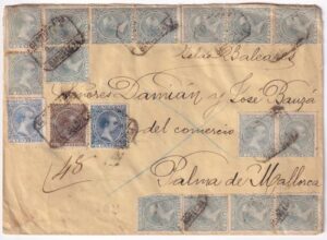 1898. Franqueo espectacular, certificado de Barcelona a Palma de Mallorca.