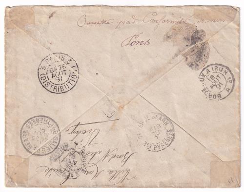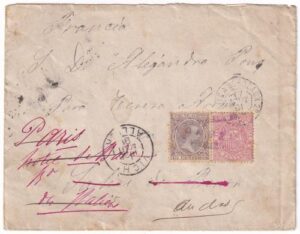 1891. Bonita carta con sello de 15c más timbre Movil de 10c con cartería de Azañón (Guadalajara) a Bearn y reexpedida a Salies (Francia).