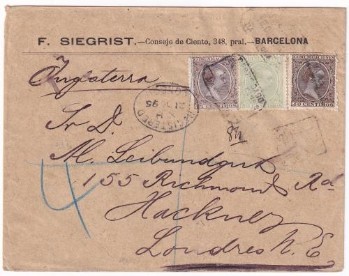 1895. Muy bonito certificado de Barcelona a Londres.