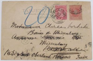 1902. Tarjeta postal de Barcelona a Bruselas franqueada con sello de Bélgica (Yvert nº38) y reexpedida a Suiza.
