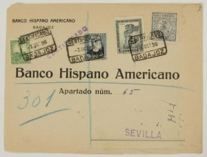 7/oct/36.Bonito franqueo +5c paro obrero en sobre certificado de Badajoz a Sevilla