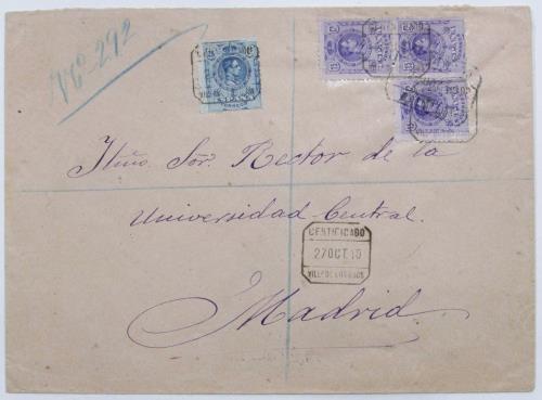 1910. Precioso certificado de Villanueva de los Ojos (Ciudad Real) a Madrid.