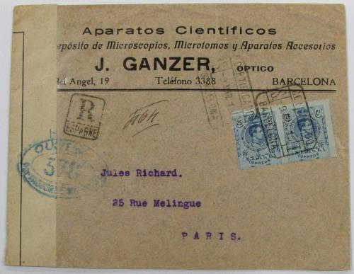 9/mar/1916. Muy bonito sobre certificado de Barcelona a París con censura militar y faja francesa.