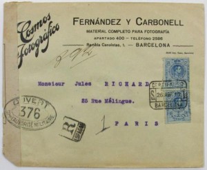 26/abr/1915. Muy bonito sobre certificado de Barcelona a París con marca y fajas de censura militar francesa.