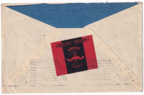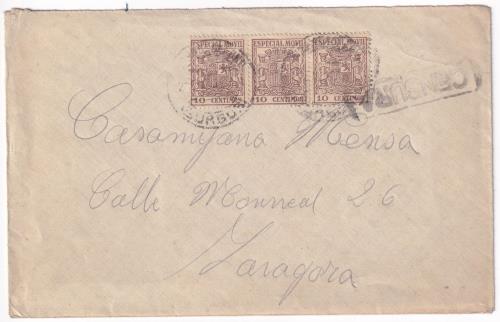 28/dic/1936. Carta de Miranda de Ebro (Burgos) a Zaragoza, franqueada con tres pólizas de 10c más 10c falange, y llegada al dorso.