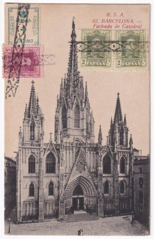 Preciosa tarjeta postal de Barcelona a Bruselas, sellos inutilizados a la llegada con matasello belga.