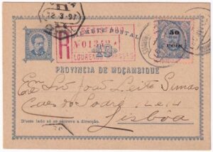 12/mar/1897. Precioso Entero Postal de 10r con franqueo complementario, certificado de Lorenzo Márquez a Lisboa.
