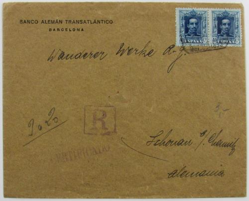 1928. Muy bonito sobre certificado de Barcelona a Alemania.