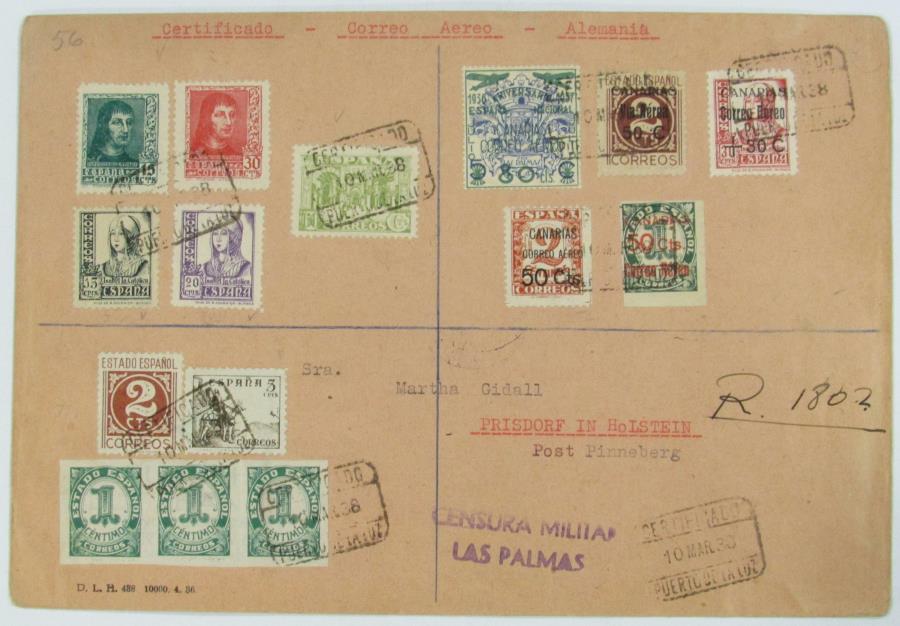10/3/1938. Franqueo espectacular en sobre certificado por avión de Pto de la Luz a Pinnneberg (Alemania).