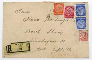 1938. Franqueo mixto en sobre certificado de Viena a Suiza.
