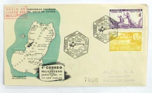 Precioso sobre del 1º vuelo de ensayo por helicoptero certificado de Santa Isabel a Barcelona.