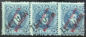 Bonita y rara tira horizontal, tercer sello con gran error de impresión en la sobrecarga y además de abajo a arriba.