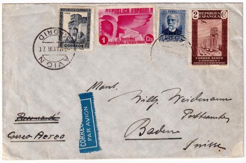 1936. Preciosa carta por avión de Madrid a Suiza.