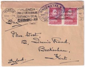 15/mar/1937. Preciosa carta de Valencia a Inglaterra, matasello rodillo y censura.