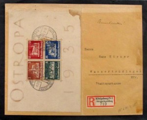 1/jul/1935. Rara hoja en carta certificada de Königsberg a Wassertrüdingen. Muy bonita pese a ligera manchita.