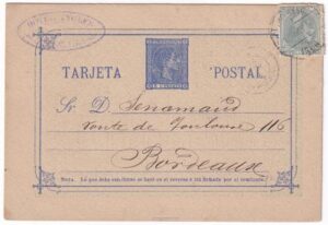1881. Bonito entero postal de 5c más sello de 5c, de San Sebastián a Burdeos con matasello ambulante por Irún.