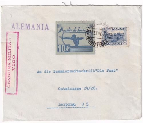 23/ene/1937. Preciosa carta de Vigo a Alemania, con sello de 50c y 10c de Auxilio de Invierno, con censura militar.