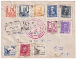 1938. Bonito certificado con espectacular franqueo de San Sebastián a Bélgica.