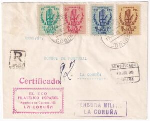 19/jul/1938. Precioso certificado circulado por interior de La Coruña.