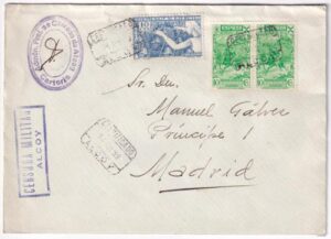 24/jul/1939. Precioso certificado de Alcoy a Madrid. Muy raro en carta, solo circuló del 15 al 25 de julio.