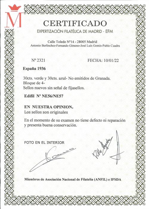 Preciosa serie no emitida. Fotocopia del certificado EFM del bloque de cuatro del que provienen.